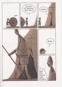 Goliath! That’s bound to conjure a mental image in your mind, probably complete with the idea of him being a raving, unstoppable beast. I mean, you don’t have to be religious at all to know the story of Goliath and how David took him down with a simple sling. But when you get right down to it, the Bible doesn’t have much to say about the temperament of Goliath, or how he spent his days. That gives Tom a lot of room to play with, and he takes full advantage of it here. The Goliath of this story is in the Philistine army, sure, but he prefers admin work to anything to do with war. He’s just trying to live as simple a life as he can under the circumstances, which is that the two armies are at an impasse. So somebody in the Philistine hierarchy comes up with the idea of a champion vs. champion battle to settle the war, and Goliath sure looks like anybody’s idea of a champion. It takes some arm twisting, but they eventually talk him into it, mostly because he agrees that anybody from the opposing army who sees him will be so terrified that they’ll surrender without a fight. The bulk of the back half of the book is Goliath (and his shield bearer) issuing his challenge and waiting to see if anybody will take him up on it that day. Everybody knows what’s coming, but Tom manages to make that ending funny and sad all at once. And then very quickly gross, but I’ll leave that bit a surprise for anybody who doesn’t remember the gory details of the end of the battle. Check it out, gain a new perspective on one of the oldest battles of the world! That’s almost certainly fake, but still… $16.95