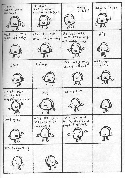 A terrible comic from London, OH on Monday is followed by a sweet and funny one from London England today. I’m not sure who does what here. I’m guessing that Tom writes and Simone draws just because that’s usually the order of the names, but it doesn’t really matter. They’re both essential to the success of this book. That might not make all that much sense when you consider that the art is very simple and uncomplicated, but it just works perfectly. Let’s see here, there’s a sweetcorn kernal, some wrestlers, a rabbit, a monkey nut, bread, bhagi, relationships… Lots of food stuff I guess, but this has it all. I defy anyone reading this not to be cheered up when it’s over with. $5, go to the website to order it. OK, if you don’t like this sample you don’t have to order it, but good luck not liking it.
