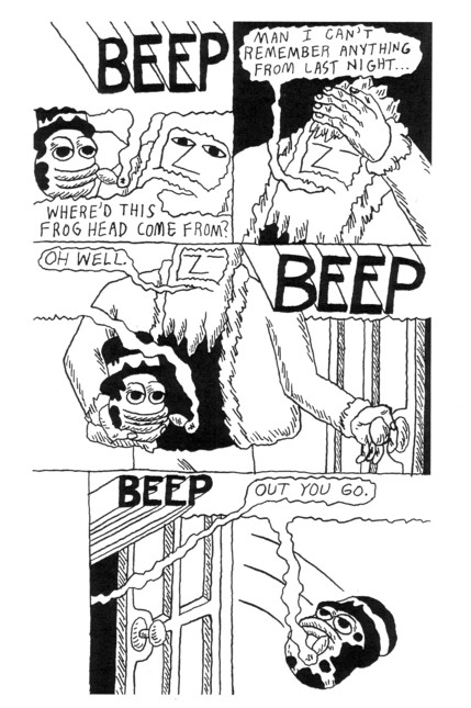 Quick, what’s going on in that cover? If you don’t have it sitting in front of you you’re out of luck, as it continues on the back cover. Froghead is sitting in front of an empty bottle of booze, and an old man (who you may remember from the last issue) is passed out nearby. It’s a nice cover; I’d sample it but the size would either screw up the page or, if I shrunk it down enough, it would lose its impact anyway. So how about the comic? The old man wakes up and is surprised to see a serenely smug frog head, as he has little recollection of the previous night. He tosses out the frog head (and I just love how it never changes expression), freshens up and starts to remember things, like how he ran into a shaman at the bar, invited him back to his house and beat his at Dr. Mario. Satisfied, the old man decides to leave to get some food and finds the frog head where he tossed it… but grown to a ridiculous size. Anything else I say is ruining the awesome, awesome ending, and I just won’t do it. I’ll just say that any ambivalence I had about the last issue is gone with this one, as this is a pile of fun. Those frog eyes will haunt you if you’re not careful, if you read this you’ll see what I mean. Check it out already. If this is what William can do when he’s rushed for a con, I say he never has to take his time on a comic again. Since the last one was $2.50, let’s just say this one is the same price.