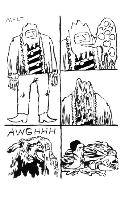 If anybody out there has a better guess at the title than that, let me know. I’m just guessing based on the first word, and then it starts melting, so who knows? This is a mini by William Cardini aka Mark Hensel, but the website listed (which is not actually his website but will connect you with his wide array of blogs) has a comic done by both William Cardini AND Mark Hensel and no, I have no idea what that means. I’m stalling the actual review here because, in fitting with the general theme of confusion going on here, I have no idea what to make of it. This is a series of one page strips with various creatures and items melting, meditating, growing or blooming, with a three page extravaganza dedicated to an utterly indescribable creature replicating. In each of these stories the creature/item starts off normally enough, then progressively devolves as the short strip goes on. Everything looks great and William/Mark is certainly not short on imagination, I guess I’m just more old fashioned in my comics reading, what with my general preference for linear stories and all. Still, there’s a lot to be said with the “where the hell is this going to go from here?” school of making comics, and I’m all kinds of intrigued to see what he does next and what he’s already done that might or might not be more accessible than this to the common folk. If you have a decent sense of artistic adventure this is worth checking out, but I’d recommend checking around that website and getting a look around first. $2.50