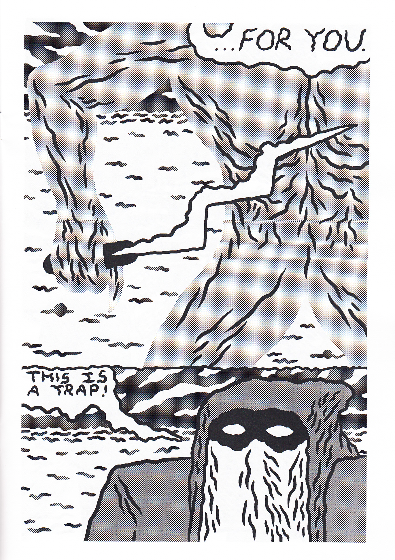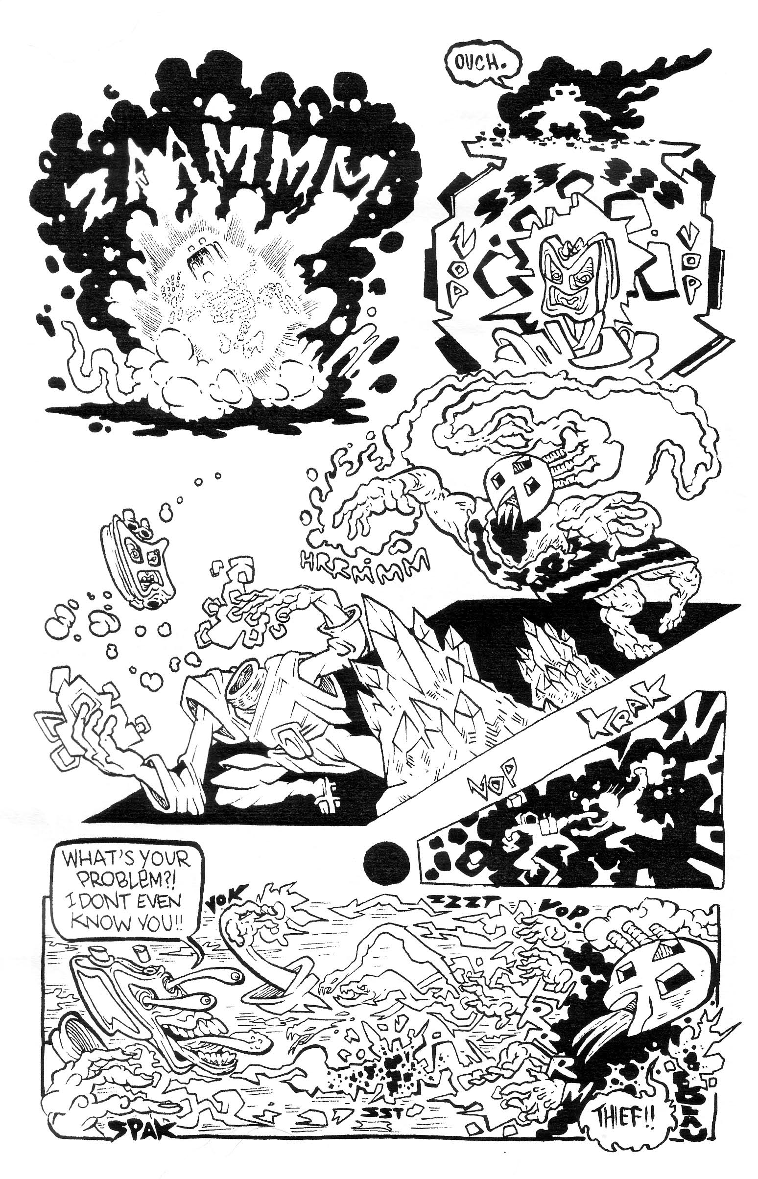 You know what I’ve always hated about any sort of wizard on wizard battle in the movies? Or shamans, or any sort of people who were supposed to have all sorts of bizarre and unknowable mystical powers? How stupid it always ends up being. More often than not it turns into a typical physical slugfest, either due to a lack of imagination or a lack of budget, and it always drags me out of whatever willing suspension of disbelief I was going through. Yes, in case you were wondering, there is a a point to all this: those two floating heads you see on the cover belong to two shaman, and their battle in this issue is exactly like this sort of thing should be. Meaning that it only has the barest appearance of a conventional fight to us normal folk, but there’s clearly all sorts of things going on beneath the surface. This issue starts off simply enough, as one shaman returns home and discovers that his thunder-root is missing. He tracks down the thief (using magic, of course), but this leads him to believe another shaman (a disillusioned shaman who’s standing near the actual thief) is the thief, which leads to an absolutely awesome battle. Go ahead, embiggen that sample below. If you’re not impressed with that you’ve clearly never spent even a second of your life imagining what an actual shaman fight would look like. The rest of the issue deals with the two shamans teaming up to fight the actual thief, but shamans never get along for long. As for the art, William/Mark and Josh mostly draw alternating pages, and it’s seamless. Sometimes it’s tough to say who would enjoy a particular mini and who wouldn’t, but this one is easy. If you’re enough of a dork to want to see a thoroughly ridiculous though oddly realistic fight between two shamans, it’s never been done better to my knowledge. If you consider yourself above such things, lucky for you there are many other mini comics in the world for you to choose from. No price again, so I’m going with $2.50.