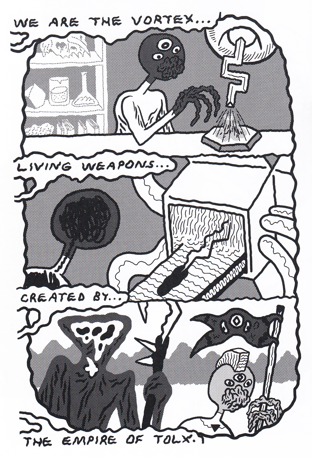 You know, as much as I love a coherent story, I have to admit that there’s a great deal of fun to be had whenever William gets the space to let his imagination run wild. And this story actually ended up making plenty of sense before it was all said and done, but there’s a lengthy setup that would have blown a hole through the brain of anybody reading this as their first issue of this series. Eh, better take a step back and get to analyzing. He does have a nice, concise recap to start things off, which is downright essential in a series like this. Just in case you haven’t read the other issues but are for some reason reading the review for this one, I’ll sum up: The Miizzzard has agreed to help free the Vortex, who are a race of shape-shifting enslaved berserkers. To do that he has to survive something called the dreamscape, and this is where William gets to go nuts. There are trials and dangers, all against the background of The Miizzzard not being entirely sure of what’s real and what’s all in his head. It’s a beautiful mind fuck of a book, and pardon my language if kids are reading this, but that one word will do far less to mess with your head than this issue will. He was nice enough to send along the next issue in the series, but so far things have been moving along really well and I’d say that this series is well worth checking out. And oh, to live in a world where this man had the money/backing to do a full color comic… $6