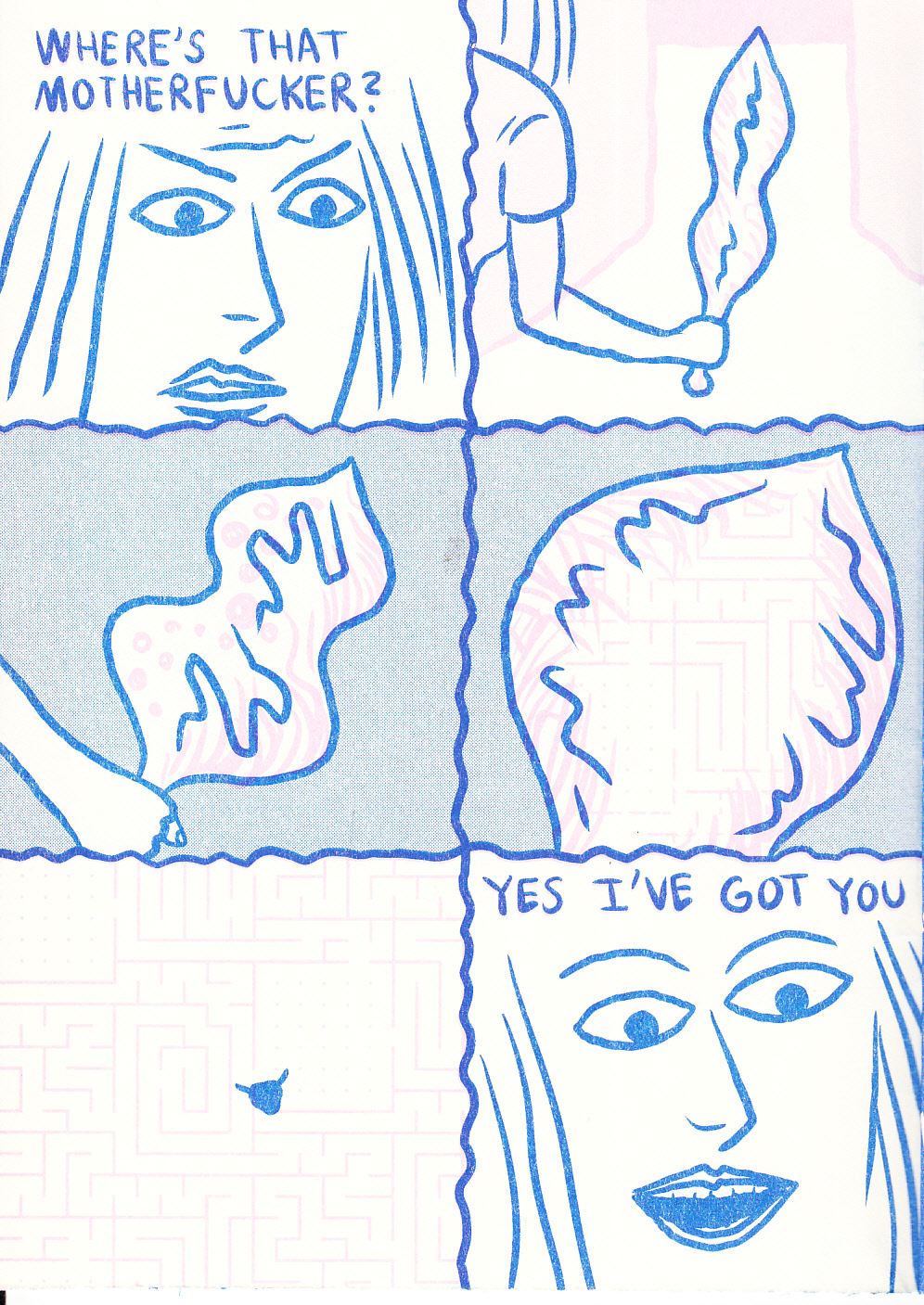 It’s been too long since I’ve gotten a chance to read a William Cardini fever dream (otherwise known as a “comic”). As always, it’s hard to talk too much about it without giving too much away, but luckily it’s impossible to give away how you’re going to feel looking at those visuals, so in that way it’s impossible to spoil. The gist of this seems to be the story of a man on a quest to kill a minotaur. Or maybe he’s just trying to get through a maze and the minotaur is a guard? Anyway, even that isn’t clear on the first page (clearly getting ahead of myself), as the first thing we see is an enigmatic creature with three eyes shifting into a large spider. From there we join our hero as he tries to track down the minotaur, until he eventually finds the already deceased creature. Which would be the end of things in a normal comic, but in this case our hero sees something wriggling around in the belly of the minotaur, and that’s when things really get rolling. This is jsut a touch less abstract than some of William’s other comics, but don’t worry, the last three pages will satisfy any cravings you have in that regard. And for the people who genuinely wonder about such things, I saw no indication that there were 9 previous issues of this series, but it’s still listed as a #10. Check it out, see what that spider thing is all about! $5