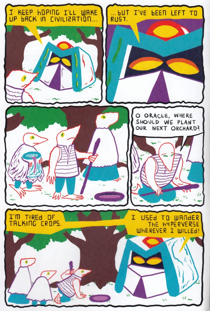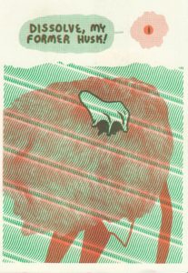 How is it possible that I missed yet another artist at CXC last year (2017)? I’ll get to the review in a second, but William mentioned that in the letter with this comic, and I clearly need a new plan for actually meeting the people who are at conventions. Do I need a checklist? Gah, I swear I must have missed an entire room full of artists. Anyway! That’s not your problem, it’s mine. Isn’t there a comic I’m supposed to be talking about? Why yes, there is! This is the story of a gigantic space being who ruins a planet with his excessive pyramids. He removes the eye from his body (which apparently carries his consciousness) and escapes the planet entirely. But he can’t resist taking a look back at what he’s done, which leads to some dire consequences for the planet. Or are they fantastic consequences? Welcome to the world of William Cardini! If you’ve never read one of this comics, you may have a bit of an adjustment period. I love the fact that William has been living in this Hypercastle world for roughly a decade now, and he shows no signs of slowing down. Or of making his work more “commercial,” although I have no idea what that would look like in this universe. I literally cannot picture a Hypercastle cartoon or action figures. But yes, the point of this review is that this is another fine entry in that world, and another peek into what makes the whole thing tick. $5