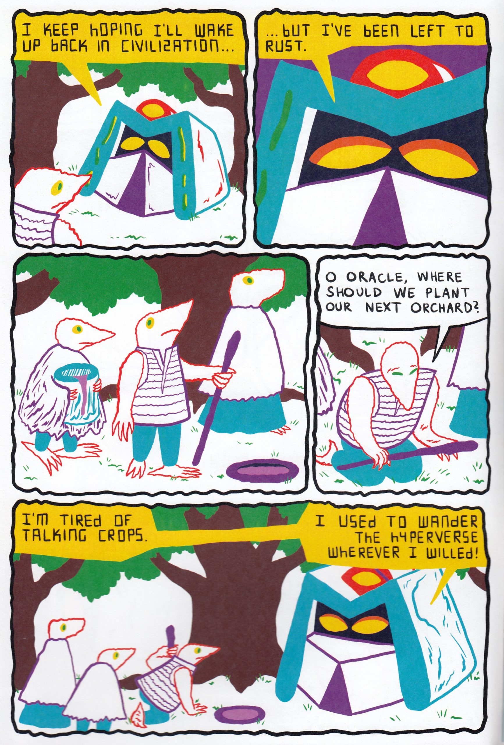 Before I get into any of the content, I just want to point out that this is one of the most beautifully colored books that I’ve ever seen. Granted, a lot of small press anthologies are in black and white, but every story in this collection is colored beautifully, up to and including the collages by Josh Burggraf. So hey, what about the content? This is a collection of science fiction stories on a variety of different themes. Some (but by no means all) of my favorites included Vincent Giard’s tale on perspective in movement and meaning, Jason Murphy’s conceptual struggle, Lala Albert’s piece on mutations caused by a certain type of water and what people do with said mutations, a lengthy wordless piece by Alex Degen about virtual reality and the consequences of dreaming, William Cardini’s depiction of the death of a planet and the aftermath, Pat Aulisio playing around in a post-apocalyptic wasteland with mad dogs and killer lizards, Aleks Sennwald and Pete Toms showing the lingering effect of ads on the environment (even long after humanity is gone), and Anuj Shreshta’s story on the increasing ease of blocking out all bad thoughts and opinions and the consequences of those actions. Aside from being just damned pretty, this is also one of the more thoughtful science fiction comics I’ve read in ages. The last two stories I mentioned alone had several comments and images in each of them that made me stop and think or examine an assumption I’d had from a different angle, which is always welcome. No anthology is ever going to be perfect for everybody, but if you can’t find several stories in here to love then maybe the fault is on your end. $18