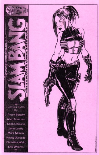 It's time to go back to another forgotten issue in my constantly growing online store, and three cheers for it being another good one. There's only one mildly weak piece in this anthology, and on further review I might have even misread that one. This starts off with a story from Allen's childhood (drawn by Christine Wald), where he tries to keep up with a friend on a much better bike through a raised dirt trail with disastrous results. Next is Moose of Terror by Mark Monlux, in which two moose (meese?) wander into a small town, followed by a small gang of wild turkeys. Eric Weems then has what is essentially an ad for the comic in which a variety of celebrity spokespeople are chosen and then discarded, and I confess to being mildly baffled by the punchline. Anton Bogaty is up next with The Short Biography of an Unknown Artist, the "weak" piece I mentioned, but looking again at that title I think this story works well as a one-pager that ends abruptly. Revenge of the Booth Babe by John Lustig (who should be on this page much more than he is, as I always get a kick out of his Last Kiss series) has an abused model of comic conventions turning the tables on the middle-aged fat guys who always make her dress up in degrading outfits. Finally there's one of the better stories of pure mayhem that I've ever seen, Power Struggle by Dean LeCrone. There's a young boy, you see, who wants a cookie. His father does not want him to spoil his dinner and so refuses said cookie. What follows is ten pages of constantly escalating violence including power tools, crapping on the carpet, stuffed animals and flesh-eating ladybugs, and that only covers the first few pages. Seriously, if the rest of the comic sucked I'd be recommending it for this story alone, and the rest of the comic is already pretty good. If you're a fan of mayhem, this is required reading. If you prefer the quiet stories, there are plenty of those on this website too, you big baby.
