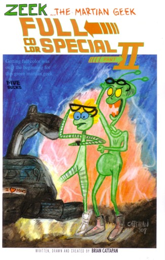 First things first: that is one fantastic cover. Seriously, just sit back and enjoy that for a second. As for the rest of the comic, yes, there were plenty of funny bits this time around. The main story in here is a long piece about Zeek falling into the, er, "Zone" (because apparently he couldn't legally say Twilight Zone) and confronting an evil cat . This piece has more geek references in it than you could shake that proverbial stick at. Go ahead, read it and see! Bonus points if you get them all, or should I say shame points, as that would confirm you as a total geek. Other stories in here include the two of them going camping, bowling, playing matrixfrisbee and discussing the true origins of the earth. This is a bit "inside baseball" as it were, but Brian also wins the prize for "mailing most likely to survive a nuclear explosion". One thing about his comics, they always get here wrapped in a ball of tape so thick that I have to cut into the package o' comics (hoping that I don't chop anything vital), and when I get inside they're usually wrapped in three layers of bubble tape. It's a good precaution, as my mail carrier usually takes "do not bend" warnings as a personal challenge, but maybe one less layer of everything the next time around? Sure, you could call that rambling that is utterly disconnected to the comic being reviewed, and you'd be right, but it's good to know for people who are going to be sending in comics, and they might be reading this, right? Right. Anyway, there are more than enough funny bits in here to make this worthwhile and really, kudos again on that cover. Oh, and I know this should be down at the bottom of the page with his other full color special, but do you know how big this entire page is at this point? I'm going to have to change the format of how pages are done one of these days purely because Brian makes so many comics.