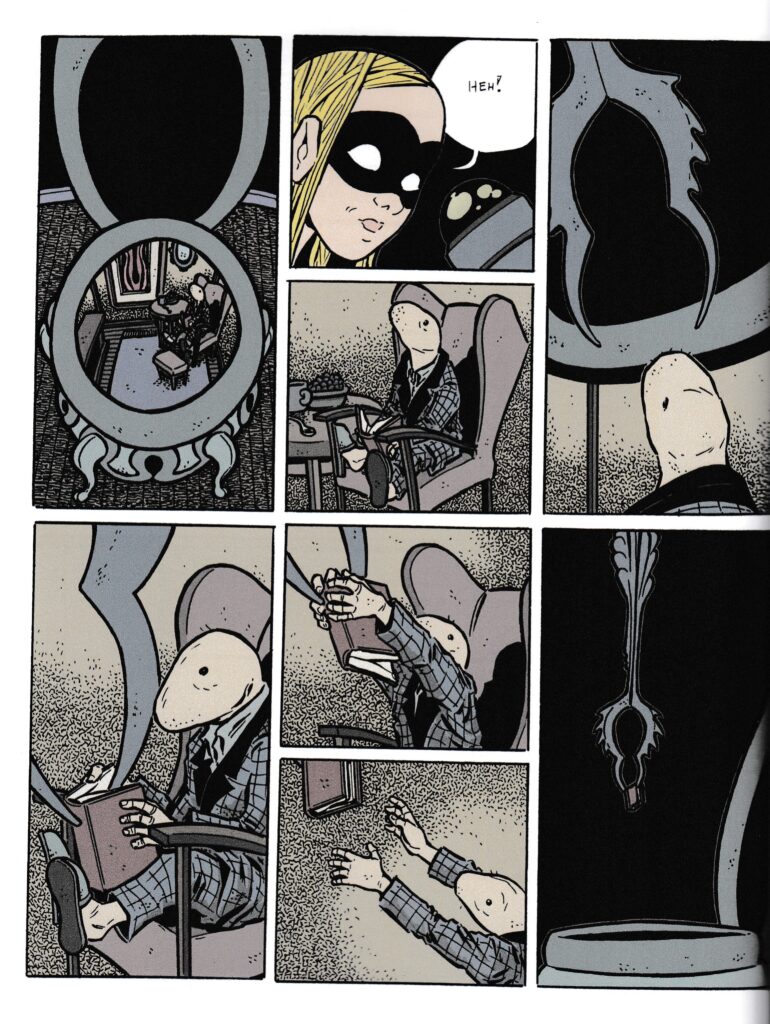 I’d occasionally like to go back in time and give the past version of myself a smack on the head. I reviewed a few comics from Hans way back in the early days of the website, starting in 2005 if my rickety archiving system is accurate. At the time it was obvious that he was an exceptional talent, which current me can confirm by reading those old reviews. And yet! I somehow managed to lose track of the guy. One look at his website shows that he’s been making books ever since, so that’s a pile of books I need to get caught up with in a hurry. Because (long-winded and meandering introduction over) this is an exceptional comic, unlike just about anything else you’re likely to see. Before I even get started on the story, I’d recommend to anybody reading this book to take your time on those panels. Every one has a level of detail that rewards lingering on it, and the choice to go full color (his previous comics were black and white) was inspired. So what’s going on in here? Oh boy. Cochlea and Eustachia are twin (?) human girls (???), and no, you cannot tell them apart unless they’re actively addressing themselves. The “human” part is dicey since one drilled a hole into the side of the other and no blood came out (there was also only a momentary sense of pain), and the “twin” part is in question because most of this volume deals with the repercussions of getting mistaken for another identical version of the girls who’s going around and causing chaos. Things start off with a mole man emerging from the his cage in the back of a giant statue of an anteater with a fancy collar (or possibly a taxidermied anteater), which rouses Cochlea from her sleep. This also lets the reader take a tour of this house, surrounded by a sea of bird skulls, which is filled with mysteries and wonders. And dangers! They’re both seemingly at constant risk of injury or death, although we do see later that the rules might be a bit different in their world. After observing both the mole man going about his day and their evil twin doing all sorts of damage, one of them is captured after being mistaken for the evil twin. Horrible things happen to her as a result (how did a phone get up there anyway?), after one particularly horrible thing happens to the mole man, and things take an ugly turn after a plug is pulled. No more from me about the story, as I feel like I may have already said too much. This volume also has a short story in the back, which shows the pair digging up a (still living?) body and doing some improvements to it, which I should also probably leave to the reader. Highly recommended, obviously, and once again, reader: take your time with this one. There’s not a huge amount of dialogue, but some of these images are guaranteed to stick with you. $25 (or $56 for a pack of volume 1 & 2)