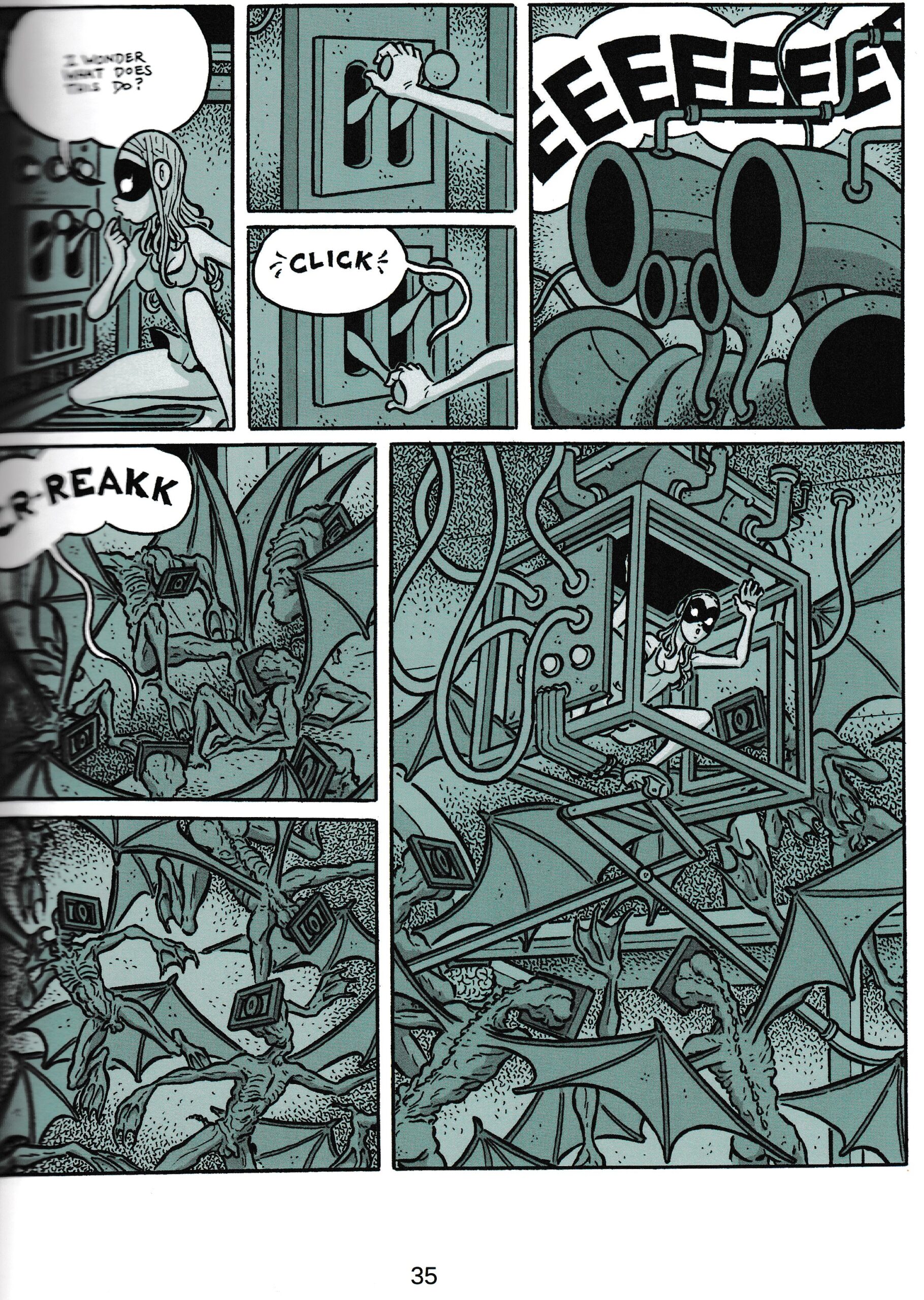 To readers of this website who are just discovering his work now and who think that maybe Hans has put out both of these books recently, a little reality check: that’s not the case. This second volume was at least a decade after the first, and he’s been working on it since 2014. If you’d told me that he spent about a month on each panel of this almost 200 page behemoth, based on the frankly absurd amount of detail in each image, I’d absolutely believe you. Just a gorgeous book from start to finish, full of beautifully detailed horrors. Should I tell you about the story? Fine, but this really is one of those cases where the art alone could carry the book. Things start off in almost a straightforward fashion: there’s a lone figure wearing a bear mask, crawling through the wreckage of civilization, hunting for a bird. He successfully knocks a bird out of the sky, cuts it open… and then removes a key from the carcass, which he uses to open up his own face. Yep, for a page or two there I was almost fooled that this was a typical post-apocalyptic story. Nope! We go inside his open face and see a character (that is soon named Fronky by Cochlea and Eustachia) who is clearly looking for something. He pulls two husks out of filing cabinets, plugs them into a device of some kind, and out come our heroes! Well, one of them, anyway. She has to pull her twin out of her husk, as she doesn’t really want to leave it. And, considering what happens to both of them throughout the book, she had the right instincts. The mystery of their origin is revealed, in case (like me) you were still curious from the last volume. Which has almost nothing to do with this one, in case you were wondering if you had to read them in order like I did. Anyway! Fronky was incapacitated somehow, and they manage to extract a black bubble from him. Which they then crack open, revealing an armadillo, which they then spend a lot of time chasing, and which figures into the overall plot pretty heavily. From there… you know, me going over this point by point doesn’t help either of us. There’s a giant with a globe for a head who’s hunting the twins, there’s a room full of exact duplicates of Cochlea and Eustachia, there’s a creep who’s using versions of them to power his vehicle, one of them loses an eye, and just about every oddity in this world is hunting them. Small details in panels are paid off beautifully down the line, and it somehow all ties together nicely. There’s a lot more nudity in this one than the previous volume, but it’s not like I’d call either of these appropriate for all ages. If you’re a fan of the odd and almost inexplicable (that somehow all makes sense in the end), I couldn’t recommend these two books highly enough. $36 (or get both volumes for a discounted price of $56)