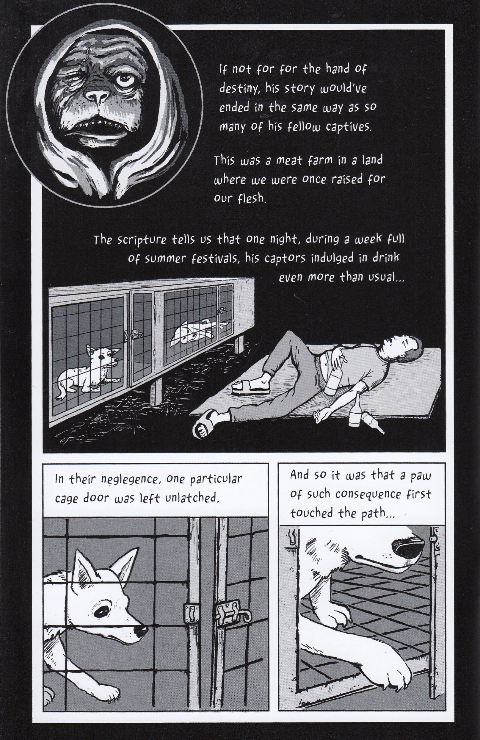 I have to imagine that most people reading this would be at least open to dogs taking things over at this point. How much worse could they do, really? This series sure feels like it’s heading in that direction, but since this issue is mostly setting the stage, we’ll have to wait a bit for the actual revolution. Tim explains in his introduction that this story was originally intended to be a background story for a graphic novel he’s working on, but a concept like that was always going to get out of hand and now he’s torn between keeping it as a short series or making it a graphic novel of its own. As you may have guessed from that cover, this story is told as a recap to a younger generation of dogs who have only known the world after the revolution. Things start off with our hero gaining awareness in a cage, trapped in a terrible and hopeless place. I originally thought it was a PetSmart or one of those places where they keep the cats and dogs caged in tiny rooms, but it’s even worse, as you can tell if you read the sample page below. Yinlod escapes, enjoys his freedom for a bit, and finally digs up a bone with mysterious writing on it. This causes him to have a vision, and I’m assuming we’ll get more information on that the next time around. Tim also included the first chapter from the graphic novel that this story was originally meant to be part of, which was maybe kinda sorta autobiographical up to a point? He mentions in his introduction to that story that he was suffering through a breakup while writing it and the character was suffering through a breakup, so maybe I’m just assuming over here. That one goes along like you might expect for a few pages, before his dog gets up on his hind legs and makes him breakfast. I’m not going to lie, I’m also very curious about the direction that that story is taking. Also I hear you cat people, especially since I’m more of a cat person myself, but let’s be honest: cats could never get organized enough to take over the world. Smack it around like a ball of yarn, sure, but not run it. Two future graphic novels (probably), small bits of each included, I’d strongly recommend giving this issue a shot. Even if it isn’t up on his website quite yet, but if you get ahold of Tim he has copies available (unless he ended up selling out at Cartoon Crossroads). I think this one was $8 maybe?