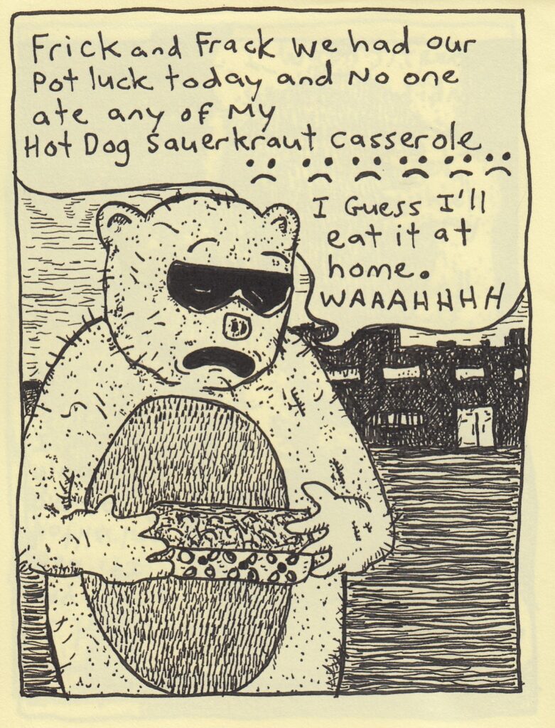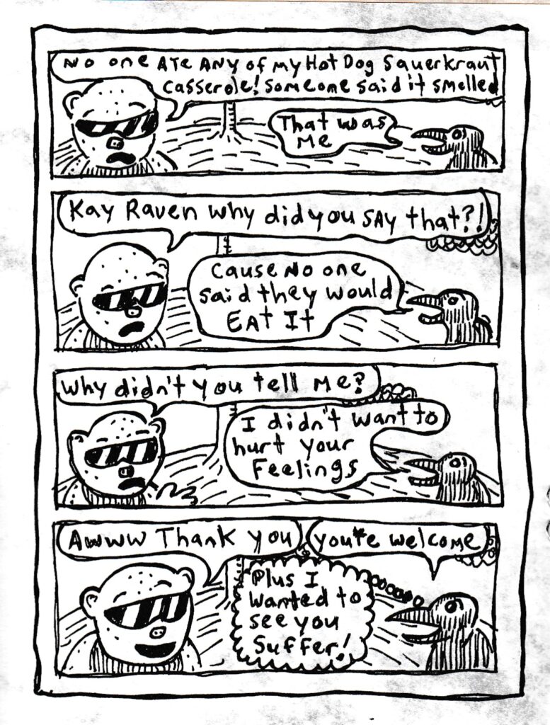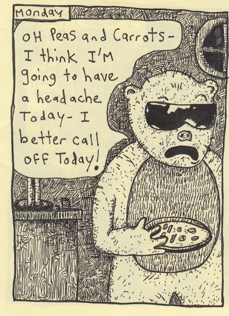 I mean, I was VERY tempted to call this “Oh Peas and Carrots,” but I doubt very much that that’s actually the title of this mini. Which led me to conclude that there probably wasn’t a title at all, so here we are! This is a delightful comic, which folds out to show different excuses for calling in sick for every day of the week. I doubt very much that any of them would work in a practical sense, but they were funny, and hey, if you’re on your way out at your job anyway, try a few of these out to see what happens! There’s also a recipe for hot dog sauerkraut casserole, which sounds horrific to me because I can’t stand sauerkraut, but honestly? The rest of it sounds pretty damned good. Which overall makes this comic pretty practical, right? Excuses for getting out of work and a workable recipe. His art style reminds me slightly of Max Clotfelter, mostly because of those densely penciled black backgrounds, but Max still has a leg up on him for sheer sordidness (which I mean in the best possible way). I managed to grab a few more of Glenn’s comics at the con and it doesn’t look like any of them have a title, so it’ll be fun trying to keep these all straight in the weeks ahead. Oh well, reviewer problems, I guess. One comic in from the guy and I’m intrigued, so check this out if you get the chance. $2 maybe?