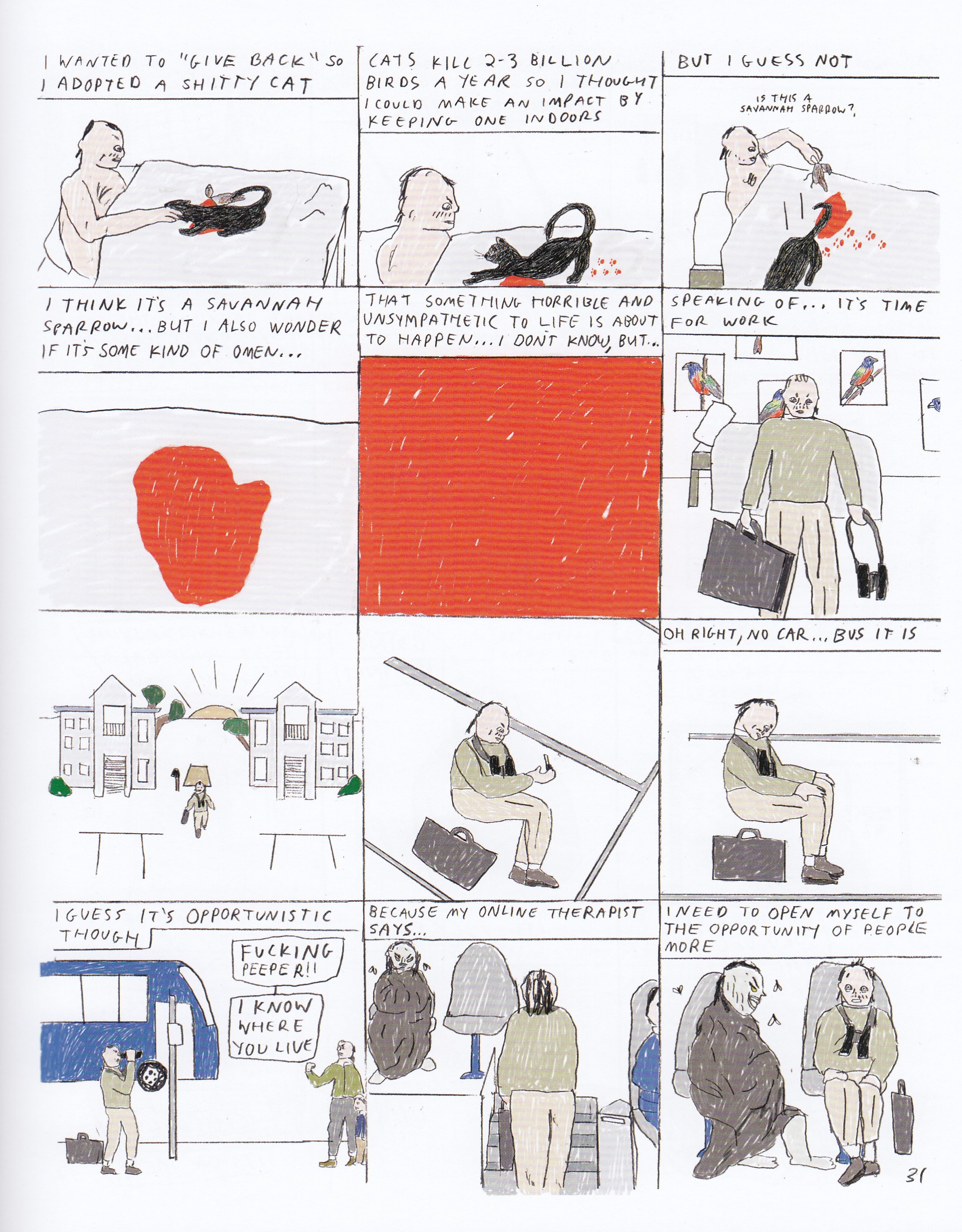 I’ve started this new tradition at cons where if I get to the table for Floating World Comics while I still have money to spend, I’m getting a random graphic novel. Sure, I could spend five minutes going through them to make it less random, but then I’d inevitably want to get half a dozen of them, and since they mostly sell graphic novels and my billionaire benefactor has yet to appear, this seems like a bad idea. I mention all of this to say that I didn’t know a thing about Emma’s work before reading this book, and flipping through it at home made me wonder why I picked it. At first glance the art is crude, but after reading it I’ve revised my opinion of the art upward (it’s sparse, but lush when it needs to be, and it’s not like the many panels of Egbert thinking about his lot in life need lavish backgrounds). But the story more than makes up for anything else I might think is lacking. This is the story of Egbert, a thoroughly miserable dude who only finds meaning in his bird-watching habit. But he’s terrible at that too, consistently being the one with the fewest sightings in his club. Even in his club of kinda sorta societal rejects he stands out as pathetic, and he’s consistently unpleasant enough that he doesn’t evoke any kind of sympathy from his peers. We spend a whole lot of time with Egbert in his (completely alone) home life, where he actually puts himself through “training” to become a better bird watcher (I’m not going to spoil this wonder by revealing his methods), talks a lot about (and to) his “online therapist,” and falls in love with anybody who’s even slightly nice to him (but he doesn’t seem to have much of a idea of what love is). I was settling in for another comics tale of a sad sack loser when something happens that changes the whole dynamic: Egbert finds a severed hand in a tree. Suddenly he has the respect of his peers, has an interview scheduled on the news, and overall thinks this is his big chance to make a splash. And, predictably, it fizzles out; there was never a realistic chance of the evening news airing a long interview with a guy who found a hand. But now Egbert has the itch and knows what he has to do to get attention, so how far will be go to chase that high? It’s a genuinely funny book on top of all of that; the recurring gag of him being called a creep because he was walking around everywhere with binoculars surprised me several times, as did his habit of completely forgetting that he owned a cat. I wouldn’t call it a laugh riot, but it’s an engrossing and balanced read, and Egbert even gets the confrontation he was dreaming about by the end. Check it out, it also turns out that Emma has several other books available, so my graphic novel purchase might be a little less random next year. $20