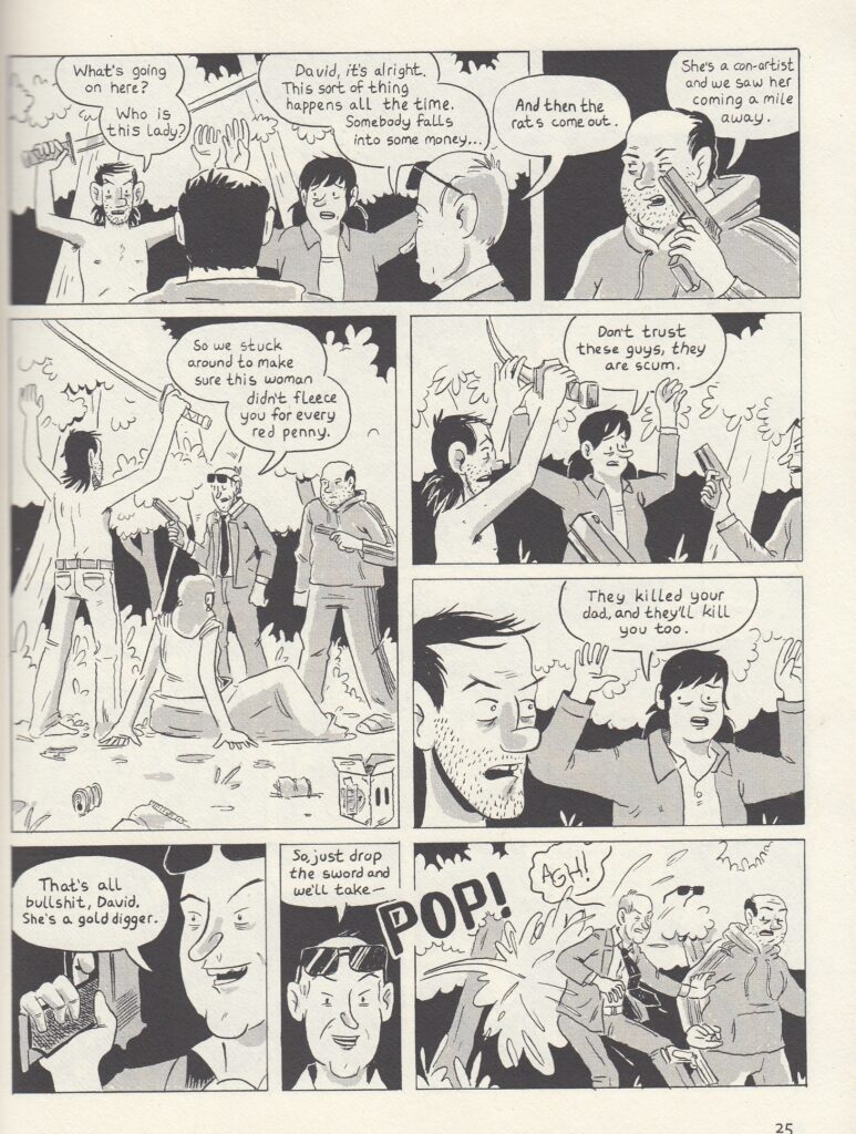 I finally met Sean for the first time at Cartoon Crossroads this year (or at least it seemed to both of us like it was the first time meeting; it’s always possible we met briefly at a previous con and then forgot) and he’s delightful, in case anybody was wondering. When he told me that this book was a collection of previous stories from his anthology Rust Belt Review (up to #7 as of this writing, and for anybody who wondered why I stopped reviewing them after the first issue, I just haven’t seen any more out in the wild) I figured it would be a collection of unconnected stories, but since I’ve liked his other comics I had no troubles with that. Reader, this is a graphic novel, and a damned good one at that. It flowed seamlessly, with no indications that it was previously released in serial form in his anthology series. I actually reviewed the first maybe dozen pages years ago, and it’s after that that things really start getting good. The basic story is that there’s a slacker named David living at his friend’s house, going nowhere in life, until his friend decides to move back and gives David an ultimatum to move out. That’s right around the time that David’s father reportedly died, leaving him $20,000, which is what he needs to maybe work on his dream of starting a landscaping business. But of course he throws a party first, and that’s where the reader sees that he’s under surveillance. The cast of characters just keeps growing from there, as we quickly learn that a large amount of money was stolen by David’s father (closer to millions than $20,000), the people who had the money stolen are trying to track it down, his father’s old partner is also trying to track it down, and Sean keeps up an admirable pace with this heist story. Well, not heist, I guess, more of a “getting the money after the heist” story. Is there a word for that? Anyway, it keeps you guessing throughout, Sean spends the time necessary to make every one of these characters feel believable and real (with their own quirks and problems), and it all comes together beautifully in the end. Thoroughly recommended, give it a shot why don’t you? $20