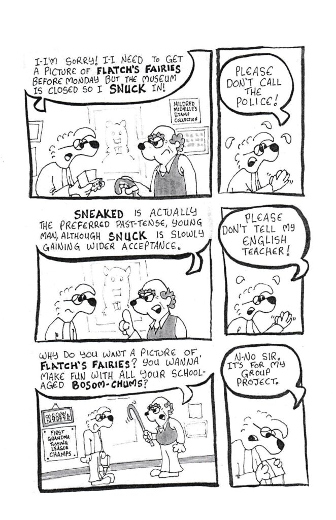 Matt’s taken time off comics here and there (go to his website, he’s very clear about the release dates for his books), so it’s heartening to see that he has a release schedule now and he’s clearly sticking to it. Two comics in two months is impressive in the small press comics world, but he’s clearly planning on keeping these monthly, and I don’t see much reason to doubt him. This one is mostly about our hero Kyle getting into a jam of not finishing his third of a joint school project (which leads to the promise of bodily harm from the other two participants if he doesn’t get his act together) and trying to get out of it. Along with many, many jokes, which I guess some people might not like, but I appreciated the commitment to the bit if nothing else (and OK fine, I also laughed at more than a few of the jokes). Anyway, Kyle hears about an old hoax involving a picture of dried up corpses of fairies that were found in the woods decades ago and decides to make that his contribution to the project. But time is running short and, to put it mildly, Kyle has trouble focusing on his schoolwork, which of course leads to some shenanigans by the end. It’s another fun story, and my only complaint about the book is the fake newspaper story on the back cover of the comic. Not the story itself, mind you, just that my copy (or maybe all copies?) ended up so faded that I couldn’t really read it. It’s a minor thing, and it didn’t effect the story, but I am one of those people who watches all the bonus content for things that I like, so I would have liked to have read the whole story. Oh, the problems I have. Check it out why don’t you, give the man some incentive to keep up that monthly schedule! $1