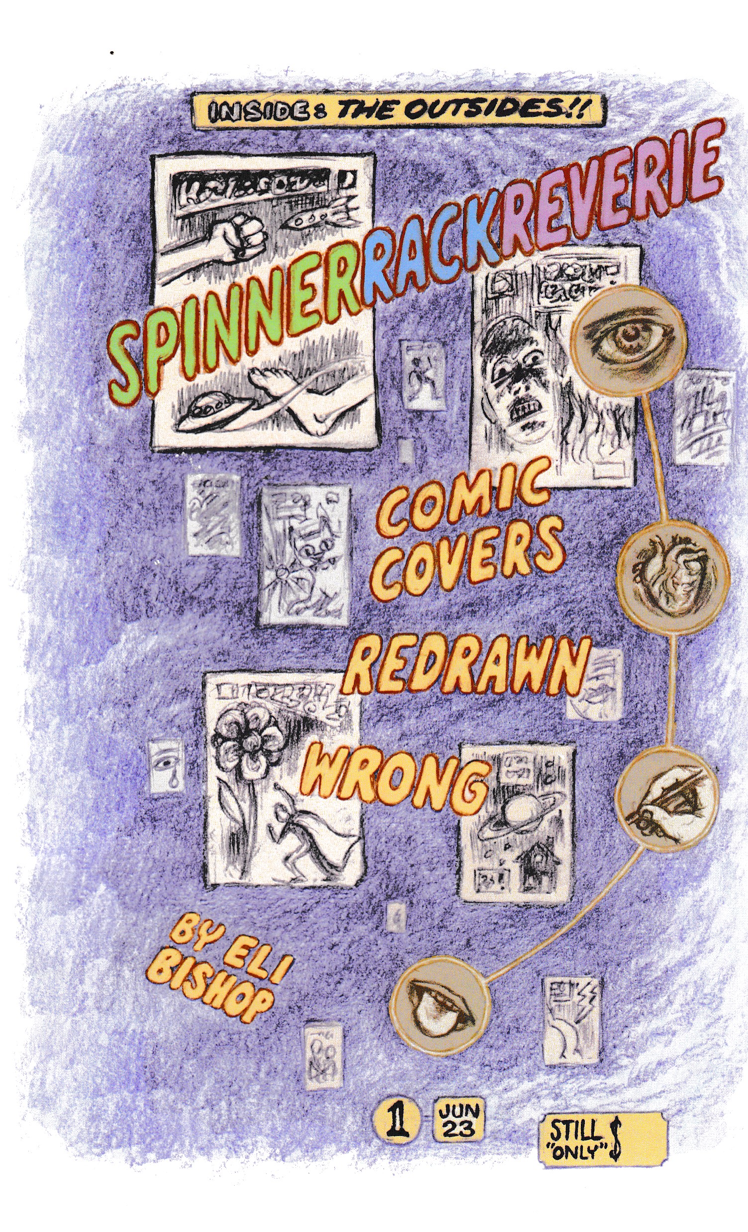 I wonder how many of the people reading this remember spinner racks. Fellow adults/middle-aged people, give me a second here. Younger folks, you could literally spin those racks in a circle, and the racks would be covered by the latest comics available. Sometimes a little digging would uncover hidden issues in these racks, or if you were lucky even the last few back issues of whatever series you were looking for. Sure, the rack kind of beat up the comics a bit, but it was definitely convenient. This not particularly helpful explainer doesn’t say much about the inside of this comic, but at least now you know what the title means! This is a collection of Eli’s interpretations of the covers of several old comics. He first shows his version of two covers, then on the following page shows the actual covers along with a synopsis of the stories and whatever he knows about the covers (or trivia about the contents, if it’s relevant). I recognized a few of these (including this one) before I got to the actual cover, and in every instance that I recognized Eli’s version was an improvement. I also hadn’t realized that so many older comics never credited the cover artist, let alone the colorist or letterer for it, so a lot of that stuff is literally lost to history. Which is why I tend to call it out when I review a mini comic with no contact information in it. Before you know it it’s 20 years later and somebody is discovering your comic for the first time, and they’ll have no clue who made it. Anyway, this was a blast for me, and I think it would also be interesting for people who’ve never heard of spinner racks (but I must admit that my opinion is not exactly subjective). $12