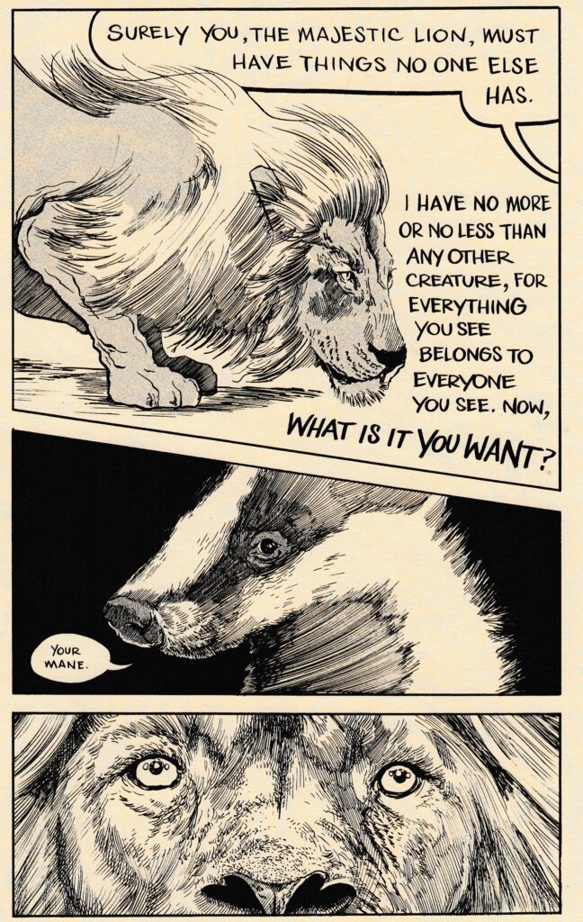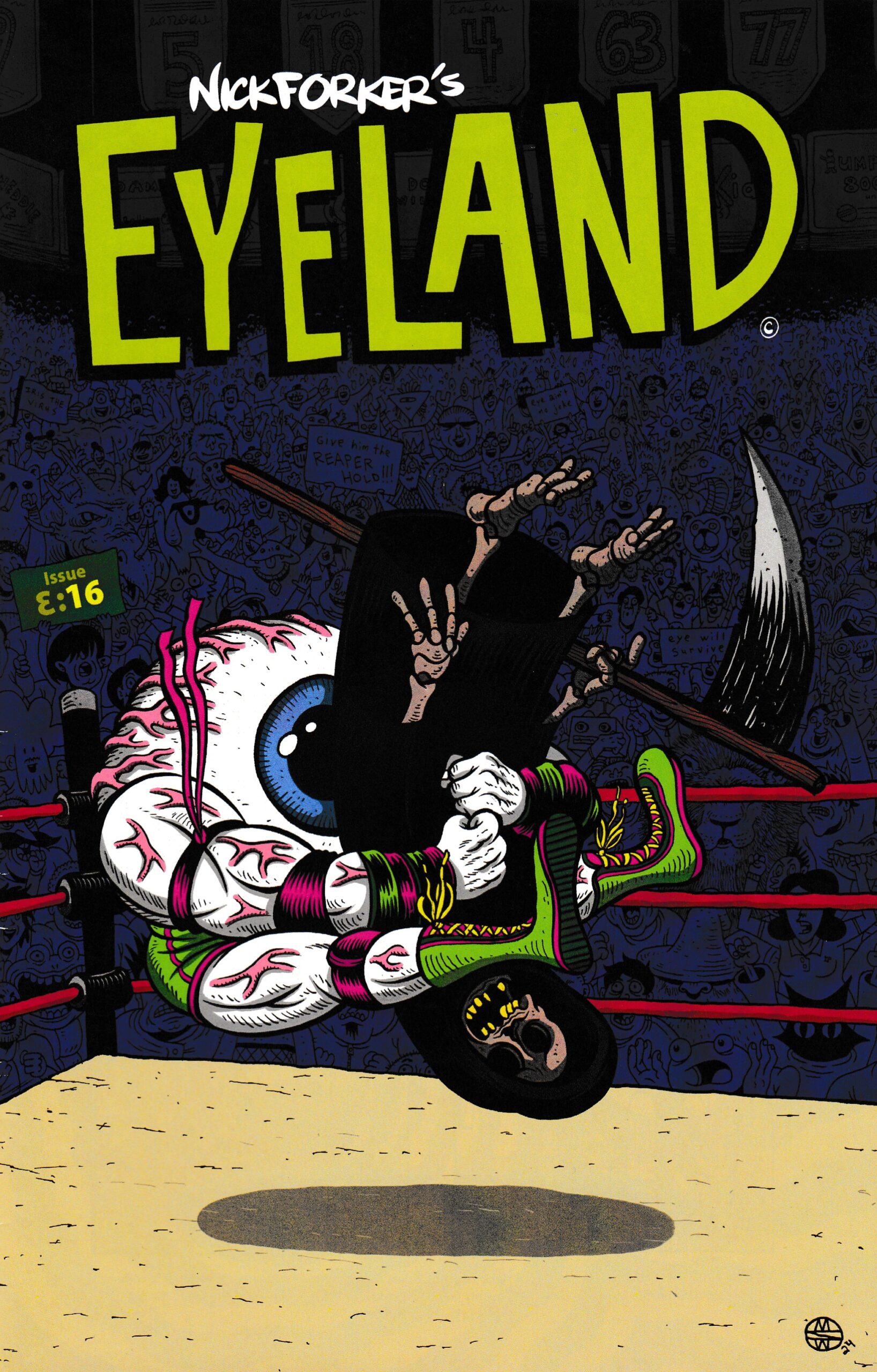 Maybe some day I’ll understand why it’s so rare for artists to have simple ways to buy their comics on their websites, but that day is not today. The link goes to a store that is currently sold out, but hey, maybe they’ll get more copies! Also back in my review for #13 I figured out that Nick is doing more continuing stories now and that I should stop my habit of reviewing random issues. I then promptly forgot all about that before reviewing this one. Better luck next time! This is a collection of several short pieces that are almost certainly parts of larger stories, but I’ll do my best. First up is the story of a badger having a conversation with several animals. He tells them that he has a secret he’d like to share with them… but only if they give up something they value. Next up is the shortest story, starring our hero the eyeball, discovering drinking, dancing and fun. I’m guessing this would have made a lot more sense in context, but I’ll get there eventually. Next is an equally short piece about an amnesiac with a cooked chicken (attached to a penis) for a head waking up in the back of an unknown vehicle. The next piece looks like the start of a story, as it deals with a young man who gets in an accident, rejects death, comes back to life and has a series of visions when he’s drifting in and out of consciousness. Finally there’s a baffling piece about a snake and a… sentient zit? The management here at Optical Sloth (me, it’s always and forever just been me) regrets not reading the previous issues for context, and will get on that in the near future. Before the end of 2025 is my pledge to you! And since it’s already mid-November, that’s serious business. The bottom line is that Nick is still putting out quality comics at an impressive pace, and I’m content just to watch his mind work, even without full context. If you’re like that too, give this one a shot! If not, the man has at least two collections available, maybe start with one of those and see what you think. $7