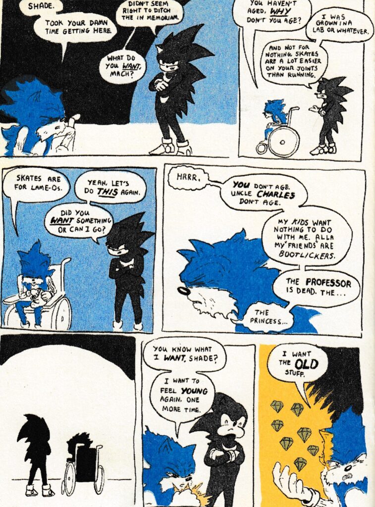 Is there a word for the feeling you get when you realize that the comic that you randomly bought from an artist at a comics convention was, in hindsight, probably not the best choice out of their available work? Eh, probably not. It’s just that in looking up Stephen’s info for this review, his Upstate series seems like it’s much more my type of thing, especially since I have no attachment to Sonic, or even enough knowledge of the characters to get what I’m pretty sure are most of the jokes in this comic. Still, I had a good time reading it, and that ending got a legit chuckle out of me. As you may have guessed, this is kinda sorta a parody of Sonic the Hedgehog, the lead character of a series of games, comics and cartoons, but set in the far future. Sonic (Mach in this book; if there’s a character actually named Mach and I’m getting this all wrong, I’m OK with that level of ignorance) starts off this comic in a grand fight with the evil Professor, and we’re quickly made aware that this is a flashback and Mach is actually an elderly hedgehog who’s being cared for by a robot. The rest of the book is an appreciation dinner for Mach (that he wants no part in), Mach catching up with an old enemy and, like I said, one fantastic ending. If you’ve got a lot of love for this character/series I’m sure there’s plenty here that I missed, but if you’re going into it fairly new like me there’s still funny stuff in here. $7
