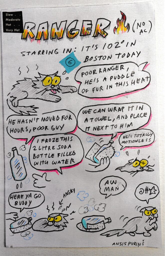 A new book from Ansis is always a treat, just to spare you any suspense regarding how this review is going to go. It was just last week that I was wearing my Zombre shirt to the gym and had the pleasure of watching a dude look at my shirt, silently mouth the word “Zombre” like it was a question, and go about his day. Too bad, as I would have had a grand old time explaining it to him if he’d asked. But hey, Zombre isn’t in this one, it’s all about cats! Do I always give comics about cats a positive review? Yeah, probably. And that’ll be true until I find the one comic about somebody being an asshole to a cat, at which point the streak will end. This one is a series of single page stories mostly about two cats (Skelly and Pip), with occasional guest cats thrown in. Ansis is also using occasional stickers and colors, mostly but not completely as part of his scanned images in the book (my cover had an actual sticker on it anyway), which made for an interesting look throughout. Side note: am I typing this while my cat Miles is literally cat yelling at me for closing the door while I’m doing this? Reader, you know it, so I’d better make this quick. Stories in here deal with the inevitable quest for quiet while you’re working (pretty on the nose for me today), the glorious dream of catching the mouse versus the reality of how much trouble it is, getting too worked up after watching a movie (cat edition), the sad origin story of Skelly (adopted as part of a bonded pair when the other half died only a week later, sadly I can relate to this one too), the tuna dance, and an unseen moment of cat peace. There are also stories about Ranger (it just never works to try to help a cat who seems too hot) and Cutlet (the shrieker) and Bob (awwww). I’m not seeing this on his website so it must be hot off the presses, but if you contact him through his website I’m thinking maybe $5 could get you a copy? I’m terrible about guessing prices so don’t quote me on that. He’s also putting out two new books next year, but for now… cats!