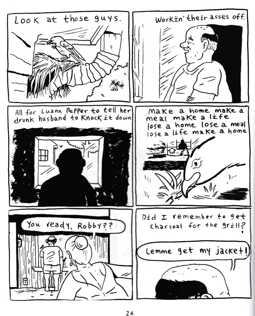 This one fell through the reviewing cracks somehow (Alex put this out a couple of years ago), which wouldn’t be all that notable except for the fact that his online store seems to be down completely and the only active link I can find for this issue goes to Birdcage Bottom Books. They’re great, don’t get me wrong, but the link shows as a security risk, so I’m using a different link that’s currently sold out. Maybe they’ll get more? Eh, I don’t know. Not the first time that I’ve reviewed something and wondered after the fact if a comics apocalypse happened while I wasn’t paying attention. Past me thought I’d be reading the previous three issues before trying to review this one, but current me is cranky and tired, so I’ll have to rely on my memory to keep these characters straight. Which isn’t as problematic as usual, since Alex put a brief synopsis at the start, and the theme of this issue is overall less about the people than it is about the town itself. The first half of this book is an oral history of the town given by one of its residents, and we don’t see any details about who or what’s happening until the end. This person goes through what the town used to be like, how the people used to interact, how sad it is that the younger generation can’t wait to get out, why they stick around, etc. If you come from a small town this one might hit you pretty hard, as it’s hard not to see some parallels to other places that I’ve lived. After a lovely centerfold depicting parts of the town (and a very brief story about Suzy), the rest of the book shows an outdoor wedding. Sure, Alex spends plenty of time with some character growth for several people (seriously, the number of things going on in the background makes me think that I still missed a few after reading this twice), but this is once again about the town and the various interpersonal dynamics happening. Also that ending didn’t involve any humans and it still got me. Here’s hoping that everything is OK in Alex’s world, as it’s odd not to see active links to his comics online. But if you can find this at a con or have better searching skills than me, give it a shot. It might not be the best single issue by itself, but it wouldn’t be possible without the character growth from the previous issues, and I’m still fascinated to see how it all comes together. $8