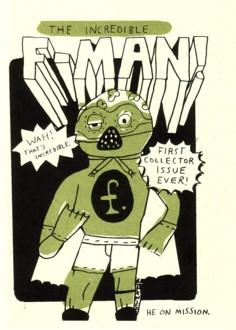 One of the best superhero comics I’ve ever seen! Not to spoil my review in the first sentence, but there you go. For one thing, my god, that costume… he’s literally wearing underwear outside of his costume, has blocky knee-pads, flippers on his hands and feet, and a lazy eye. Can you come up with a better superhero? I didn’t think so. In this issue F-Man foils an evil plot that involves his double, saves Dionne Warwick and beats up a lot of people who never see him coming. Also, the sound effect “Smoosh” to indicate flying is nothing short of brilliant. I haven’t even mentioned the dialogue yet, mostly because I feel like I should leave something out of this wonderful thing to be discovered by you guys, who are going to buy a copy of this ($2) right now. No website or e-mail address that I can see, which is a shame, but here’s his contact info: 325 N. Adams St. Sierra Madre, CA 91024, phone number: (626) 836-2210. Wah!