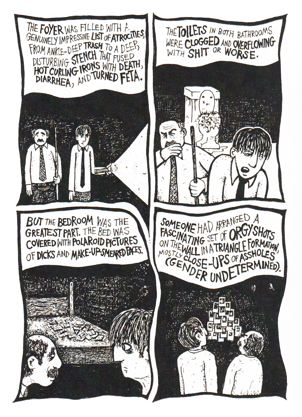 Now that is one fantastic title. This comic shows the dealings that Jim (just guessing because he’s the writer) has with the various people who rent apartments from him and/or complain about those apartments. He’s a leasing agent, meaning that he interviews people who are trying to get an apartment and takes complaints from people as they pay their rent bills. Everybody in the office hates each other to varying degrees, and Jim sees the dregs of humanity on a daily basis, which is bound to get somebody, well, exactly what the title up there implies. The first story shows the kind of complaints he gets and details his routine, including the part where his methods of escapism end up with the effect of essentially taking away all his free time and depositing him back at work on Monday. Next up is a story about a couple of kids just out of high school who clearly weren’t ready for a place of their own, but they had the paperwork in order and had stellar credit so they were granted an apartment. Parties and drunken orgies occur, and when they finally have to evict them nobody is even remotely prepared for what they find in the apartment, not to mention all the other illegal activities this scrutiny brings to light from other residents. Finally Jim gets dragged into a Homeland Security (!) sting, in which he has to ignore a man tied up in a trunk but ends up with some nice clout around the property. The story of the life of a leasing agent could theoretically be boring, I suppose, but this one has more than enough fascinating stories to make it worth a look. Dan Strauss also does an excellent job of making these people seem at least mildly human when he could have easily turned them all into caricatures. There’s some genuine humanity on these faces, and that back cover illustration showing a busy day at the pool is hysterical. Seethe on, gentlemen, I’m curious to see how many more of these terrible stories you have in you. $5
